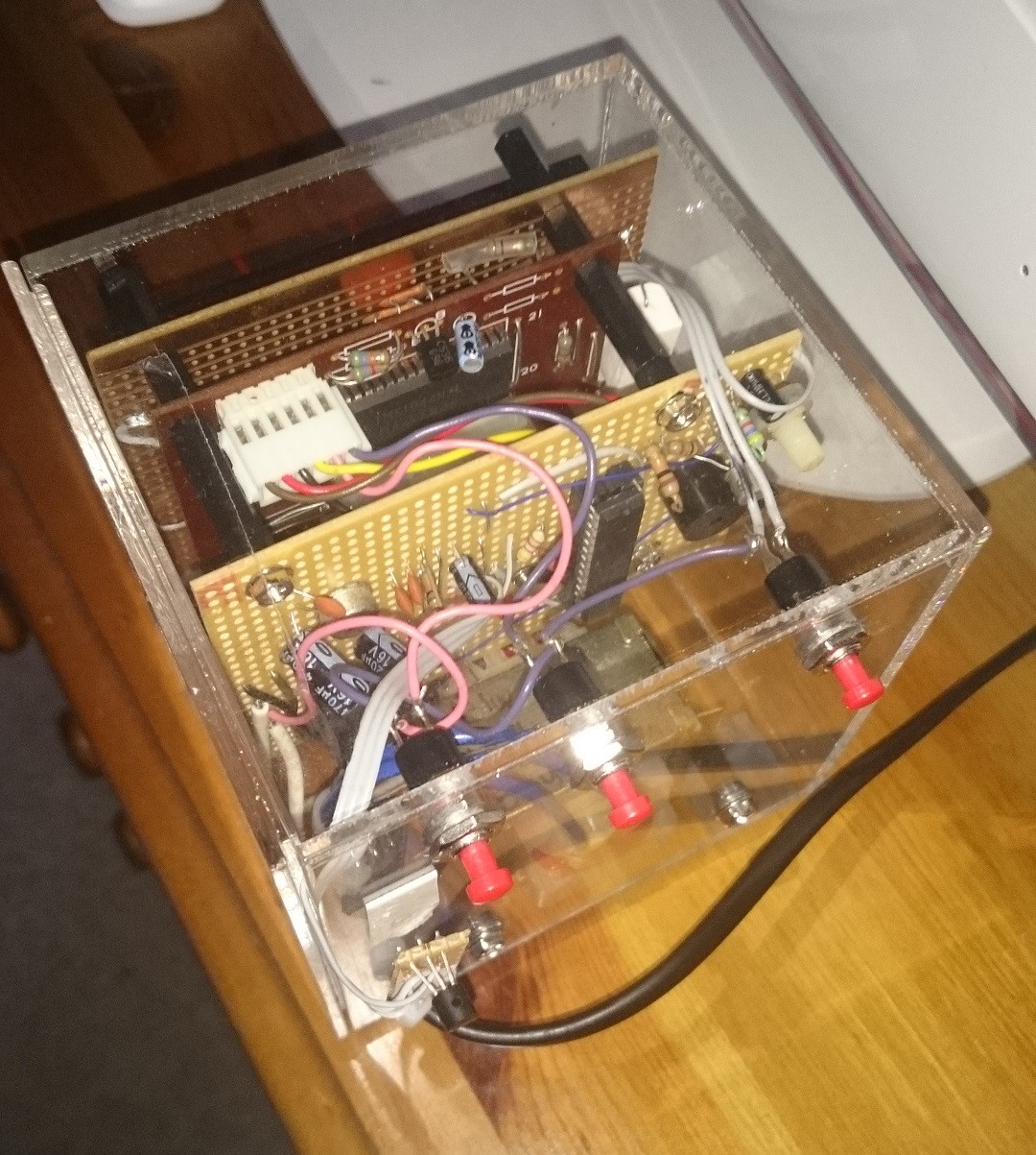 The mains transformer was mounted at the bottom of the case with the PCB’s fitting neatly above and held in place by support pillars. The temperature sensor was moved outside of the case so the heat from the electronics would not give false readings. The DS18B20 is very sensitive and heat conducted through the connecting cable will affect it’s reading.