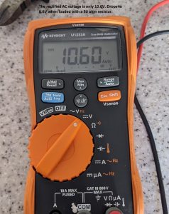 I cut the thick winding from the common neutral to confirm it was only connected to the connection with the yellow wire. So, to be able to use this transformer as a bench PSU I would need to connect the thin wires connected to the blue and black wires. These measured about 12.1 ohms and between black and the far right 0.1 ohms. Upon connecting to the mains the transformer only produced about 8.4V AC on the secondary (or primary depending how you look at it) I was expecting at least 12V and even connecting up the other tap only resulted in an extra 0.2V. I rectified the output and got about 10.6V DC which dropped back to about 8.6V when loaded with a 50ohm resistor which will put about 250mA load onto it.