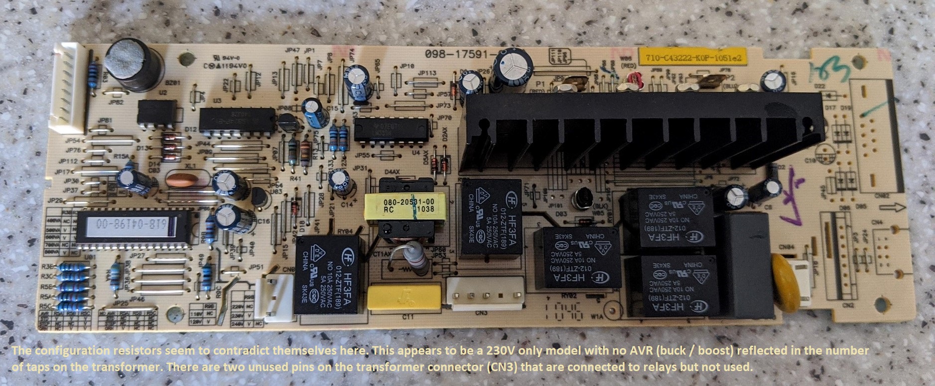 Anyway enough intro. I decided my UPS was just crap and not worth repairing; it was rated at 800VA and had a single 12V 7.2Ah battery in it with an advertised full load runtime of 5 mins. I pulled out the mainboard and noticed that it obviously uses the same board for different models with the configuration set by resistors. They seem to contradict themselves but from what I gather my UPS is set for 230V fixed with no AVR (buck / boost) and 600VA rating. No wonder it had a shit fit when I tried to put more than 600VA load onto it. Definitely said 800VA on the front and the box. Going by the transformer it is a offline / standby type although the board supports some kind of auto voltage regulation though it isn’t line interactive. There are two pins on the transformer connector connected to relays and other electronics but are not used. Perhaps by changing the transformer and configuration resistors you can make it a 220V model or one with AVR that switches taps on the transformer to maintain a stable output voltage without switching to battery.