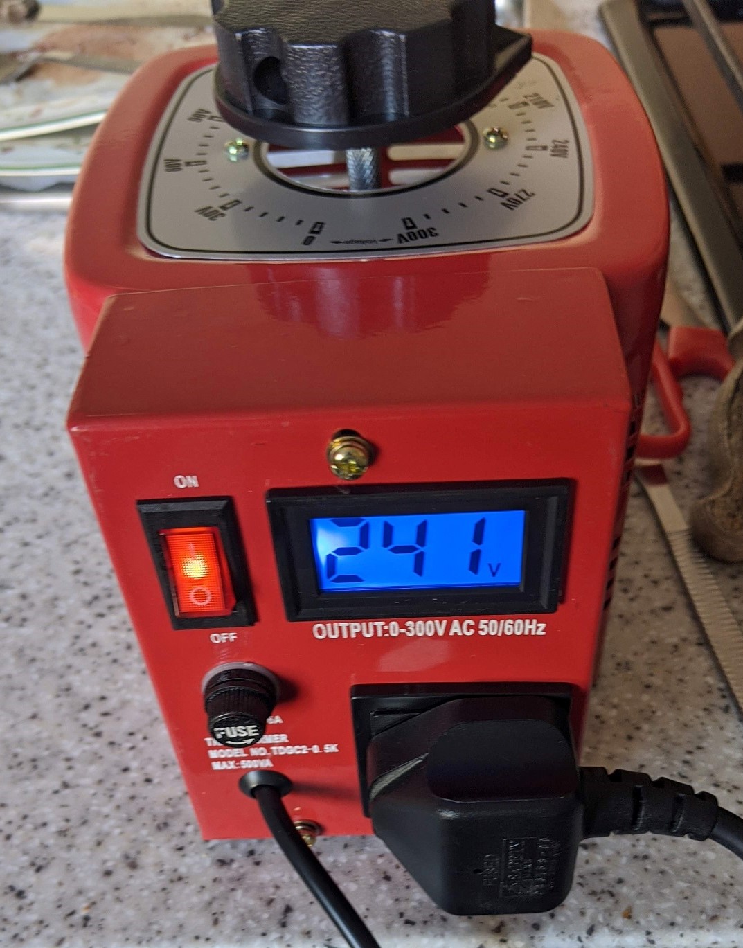 I cut the thick winding from the common neutral to confirm it was only connected to the connection with the yellow wire. So, to be able to use this transformer as a bench PSU I would need to connect the thin wires connected to the blue and black wires. These measured about 12.1 ohms and between black and the far right 0.1 ohms. Upon connecting to the mains the transformer only produced about 8.4V AC on the secondary (or primary depending how you look at it) I was expecting at least 12V and even connecting up the other tap only resulted in an extra 0.2V. I rectified the output and got about 10.6V DC which dropped back to about 8.6V when loaded with a 50ohm resistor which will put about 250mA load onto it.