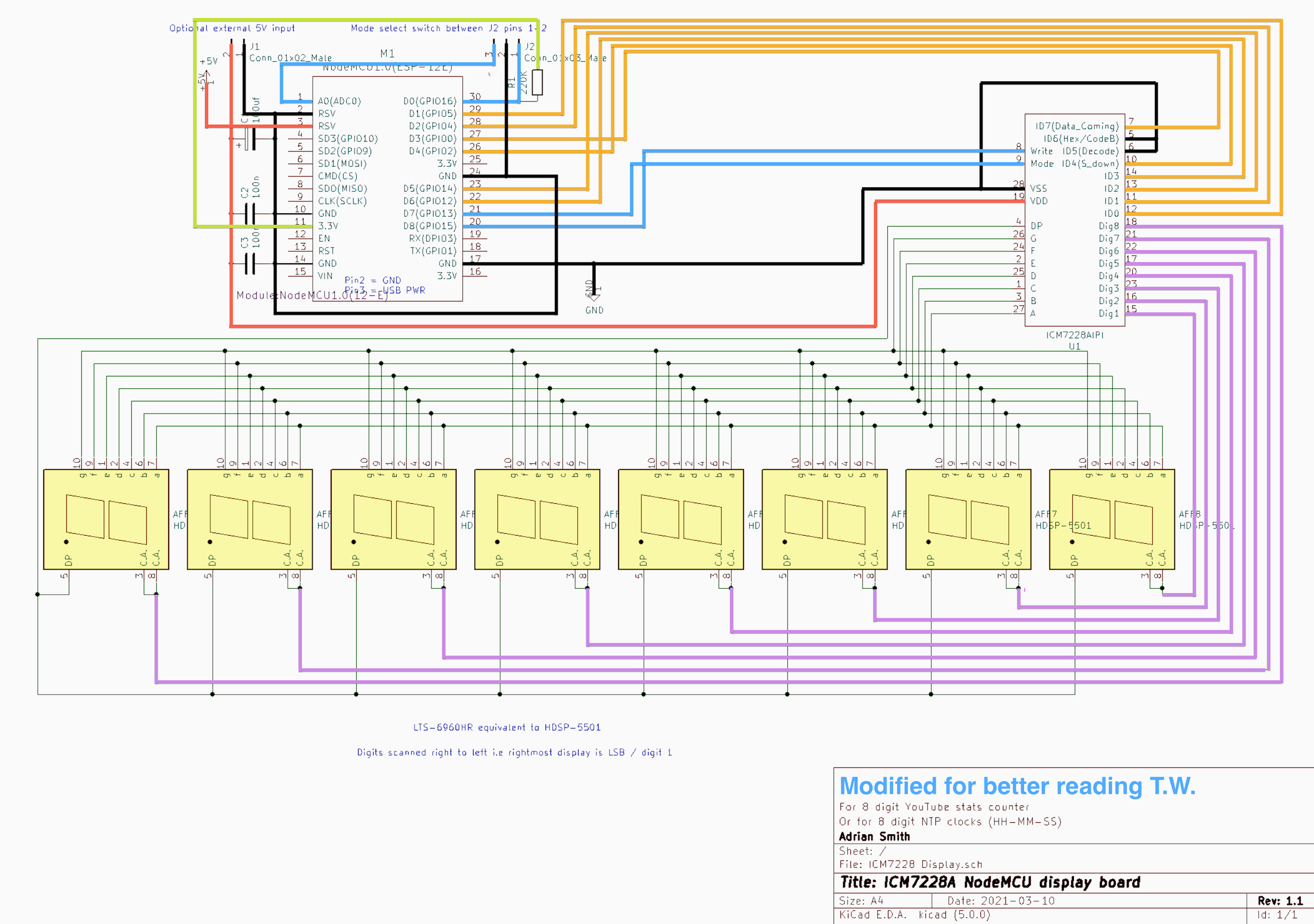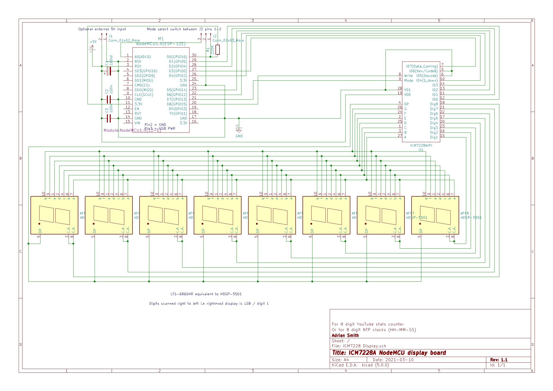 I made some internet connected 8 digit 7 segment LED displays using a NodeMCU and Harris semiconductor ICM7228A LED driver ICs the latter of which were salvaged from old aircraft avionics. As the chips would unlikely sell on eBay I decided to make them into a project and improve upon my earlier YouTube counter project which displayed the subscriber and view counts on a 4 digit and 8 digit LED display.