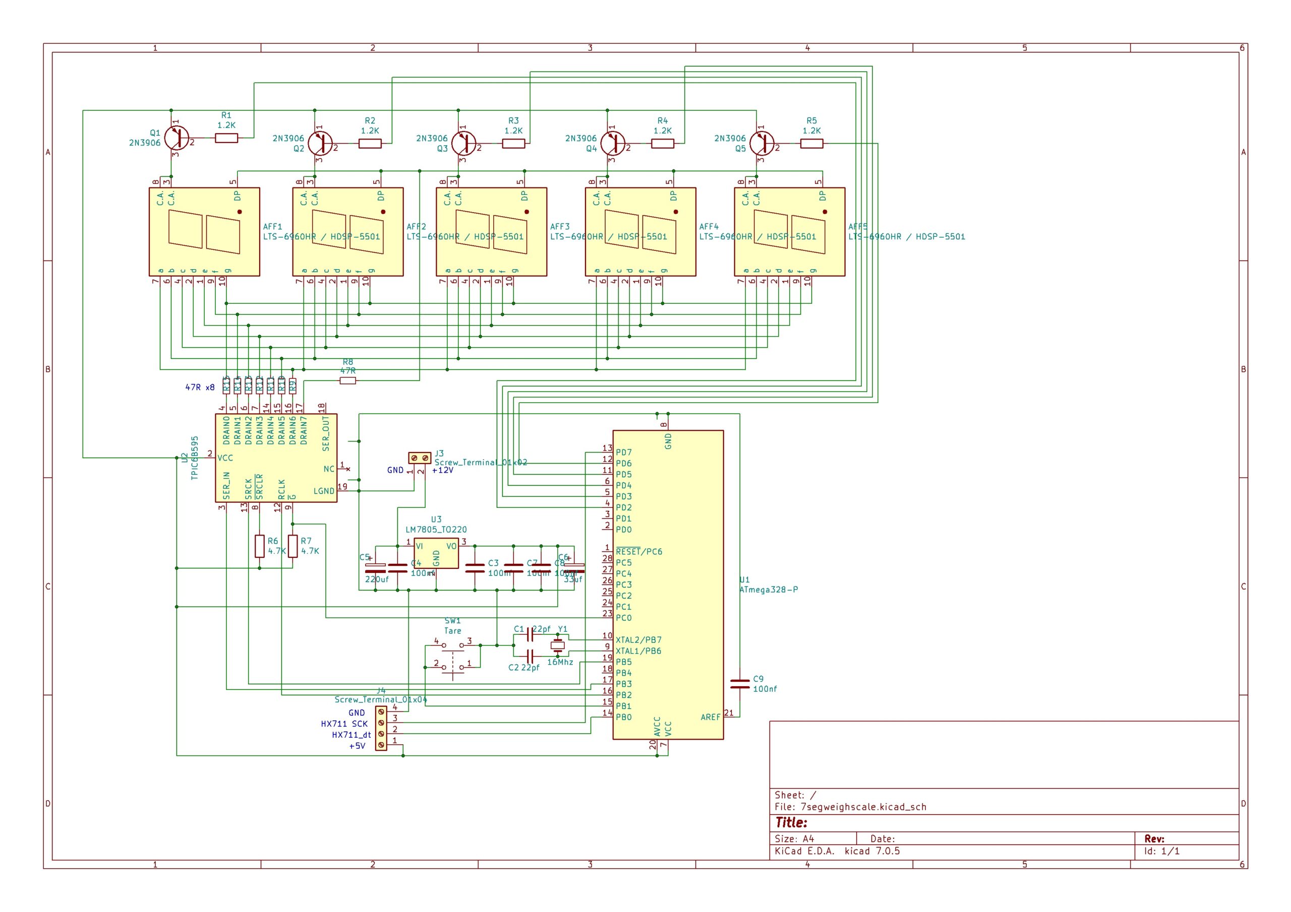 I was experimenting with load cells for a commercial project and thought I’d share one of the prototypes I built to test HX711 load cell modules. It’s built on Veroboard but I designed a PCB for it however never got it manufactured as you can buy one on AliExpress for around 3 Euros or a fiver on eBay so I didn’t see much point into going to the expense. This design uses an ATMega328P like my other version and a TPIC6B595 to drive the segments. PNP transistors drive the digits via multiplexing. You are free to check it out, use and adapt my code and design files as you wish but if you do end up using my design and publishing it online please give me credit in the description to say it has been adapted from my design.