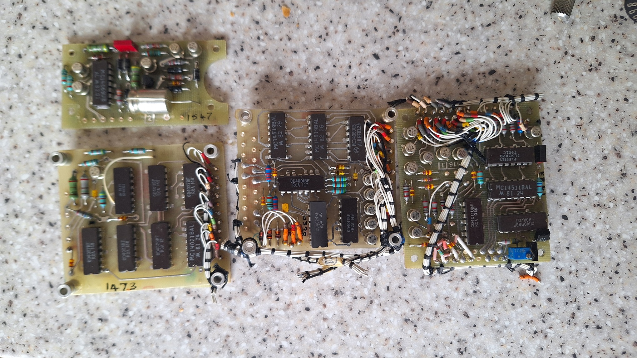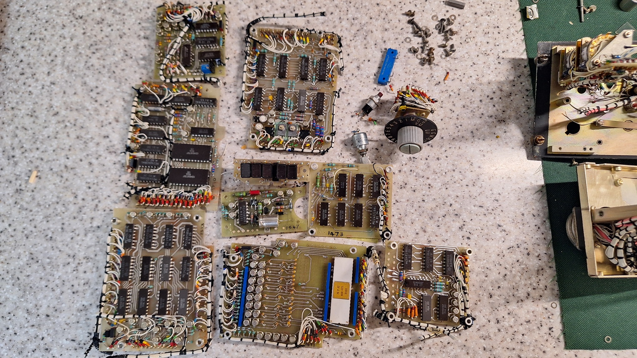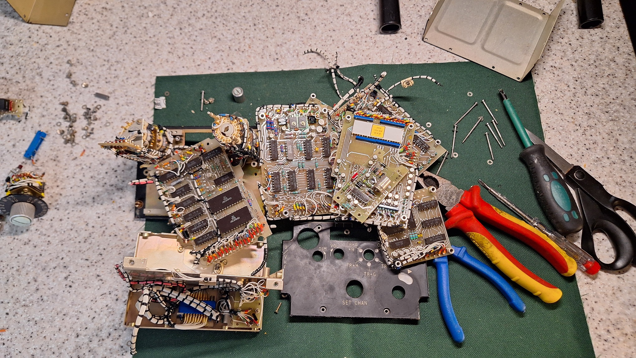Electronics wise it consists of several circuit boards populated with mainly 4000 series CMOS chips, some PLL synthesizers, transistor arrays and a custom 40 pin IC labelled NOM402L made by Mitel semiconductor which is some sort of programmable logic array.