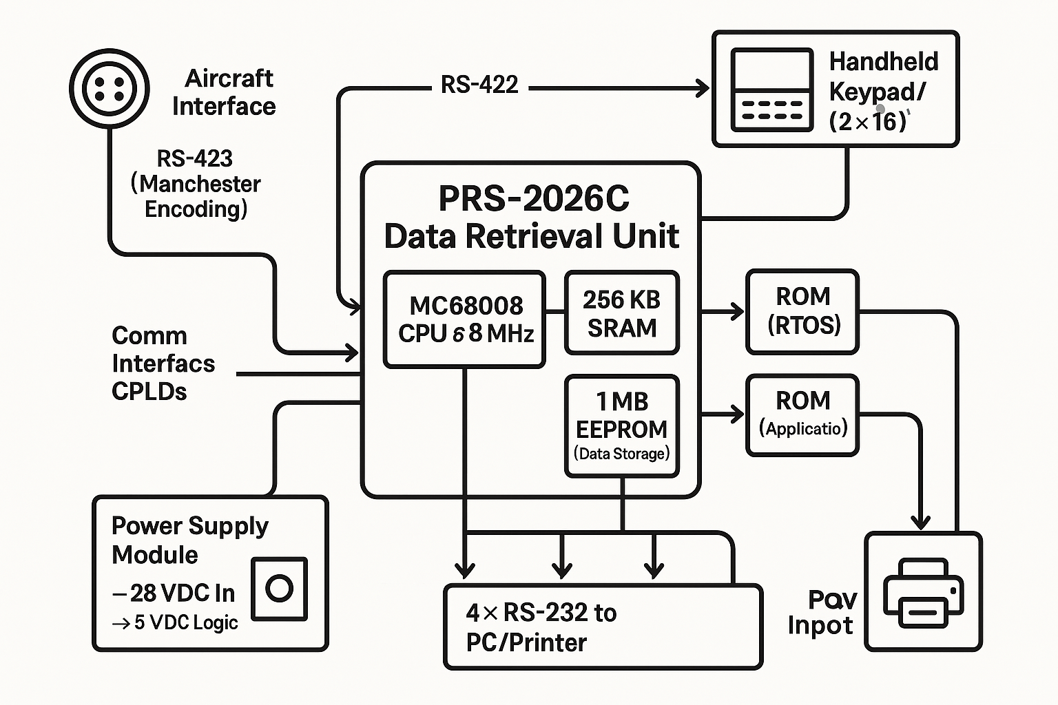 There’s no video output on this unit and data is sent to / from the aircraft over RS-423 with Manchester encoding. The keypad and LCD communicates via RS422. There are also 4 additional RS232 serial ports at TTL levels which go to a user port used for downloading the data to a PC and a printer. I also dumped the EEPROM storage and found some aircraft tail numbers amongst other data but most was meaningless to be honest.