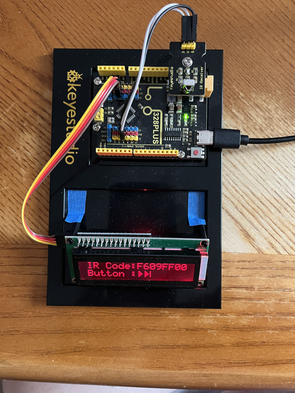 My friend Rick sent this over to me which he managed to get working – it is a sketch which displays the results of an infra-red remote control hex codes on an LCD display. Ideal for if you want to use those cheap Chinese remote controls for your electronics projects but are unsure what key produces which codes. This gadget will display the code and the button pressed on an LCD and is ideal for finding the key codes from any remote that uses the NEC protocol.